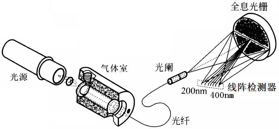 氣體分析儀的工作原理基于朗伯-比爾定律,其分析方法屬于紫外吸收光譜法。分析儀的測量單元,由光源、氣體室、光纖和光譜儀(含光闌、全息光柵、線陣檢測器)等組件構(gòu)成。