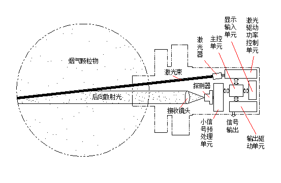 粉塵儀包括激光光源及功率控制單元、光電傳感與小信號預(yù)處理單元、散射光接收單元、顯示與輸入單元、輸出驅(qū)動單元、主控單元。激光器發(fā)出的650nm束以一個微小的角度射入排放源,激光束與煙塵粒子作用產(chǎn)生散射光,背向散射光通過接受系統(tǒng)進入傳感器轉(zhuǎn)變成電信號進行處理。電路部分實現(xiàn)光電轉(zhuǎn)換、激光束的調(diào)制、信號放大、解調(diào)、光源的功率控制、V/I轉(zhuǎn)換功能。整個系統(tǒng)的構(gòu)成包括主機及校準(zhǔn)系統(tǒng)、吹掃系統(tǒng)、連接附件及防雨箱。